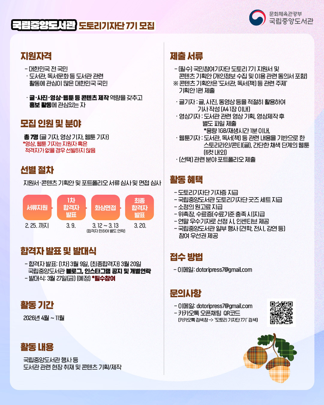 "2026년도 국립중앙도서관 국민참여기자단 도토리 7기를 모집합니다."