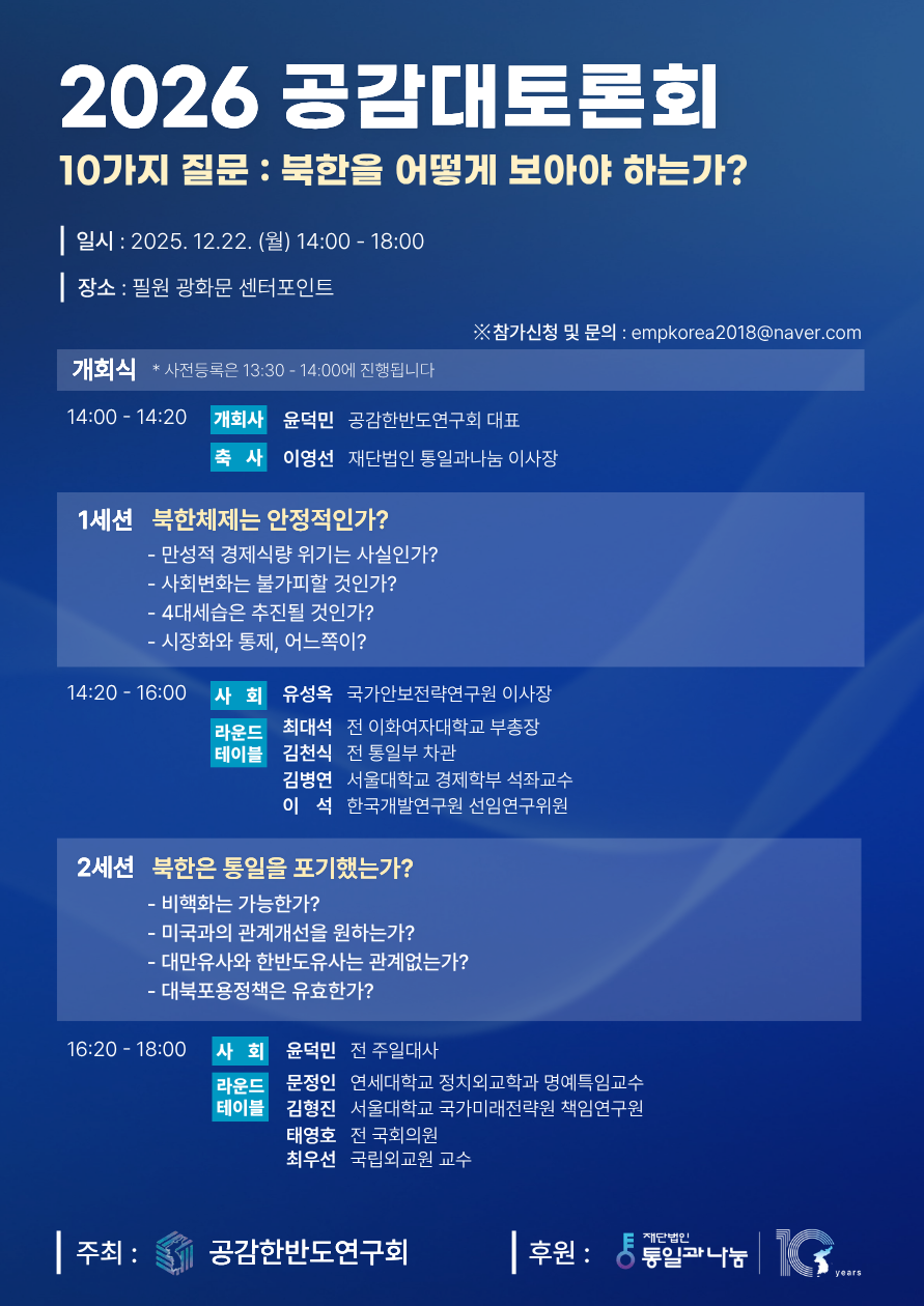 공감한반도연구회는 재단법인 통일과나눔의 후원을 받아 「2026 공감대토론회 – 10가지 질문: 북한을 어떻게 보아야 하는가?」를 2025년 12월 22일(월), 필원 광화문 센터포인트에서 개최합니다.