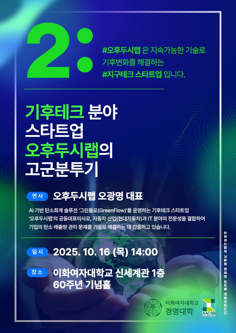 이화여자대학교 경영대학에서는 기후테크 분야 스타트업의 생생한 현장 이야기를 들을 수 있는 특강을 아래와 같이 진행합니다.