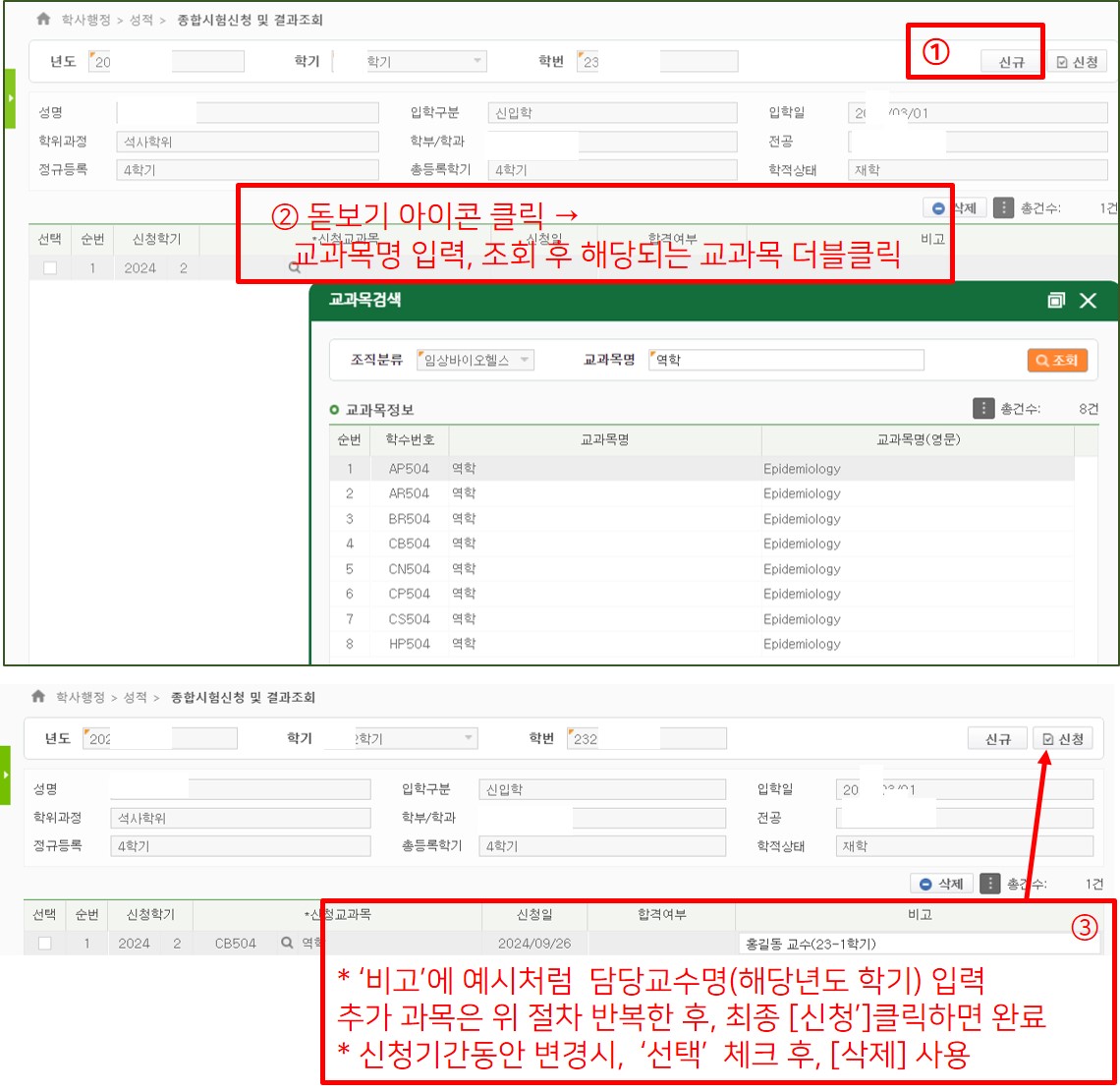 ① [신규] 클릭하여 신청과목 입력 줄을 생성