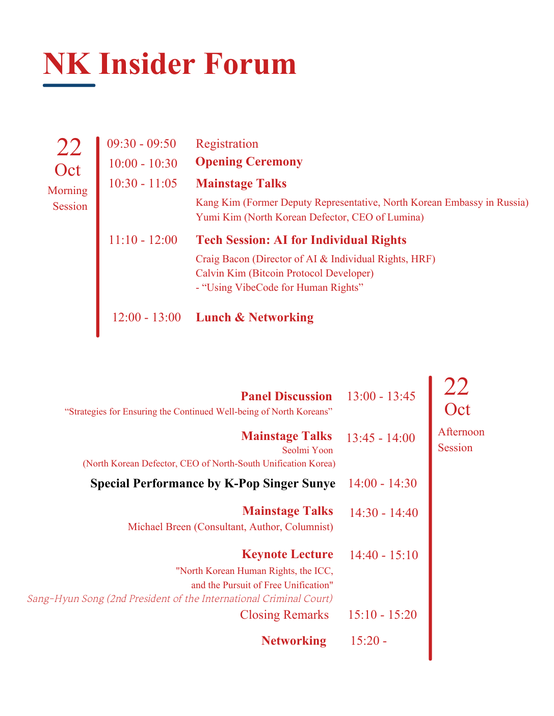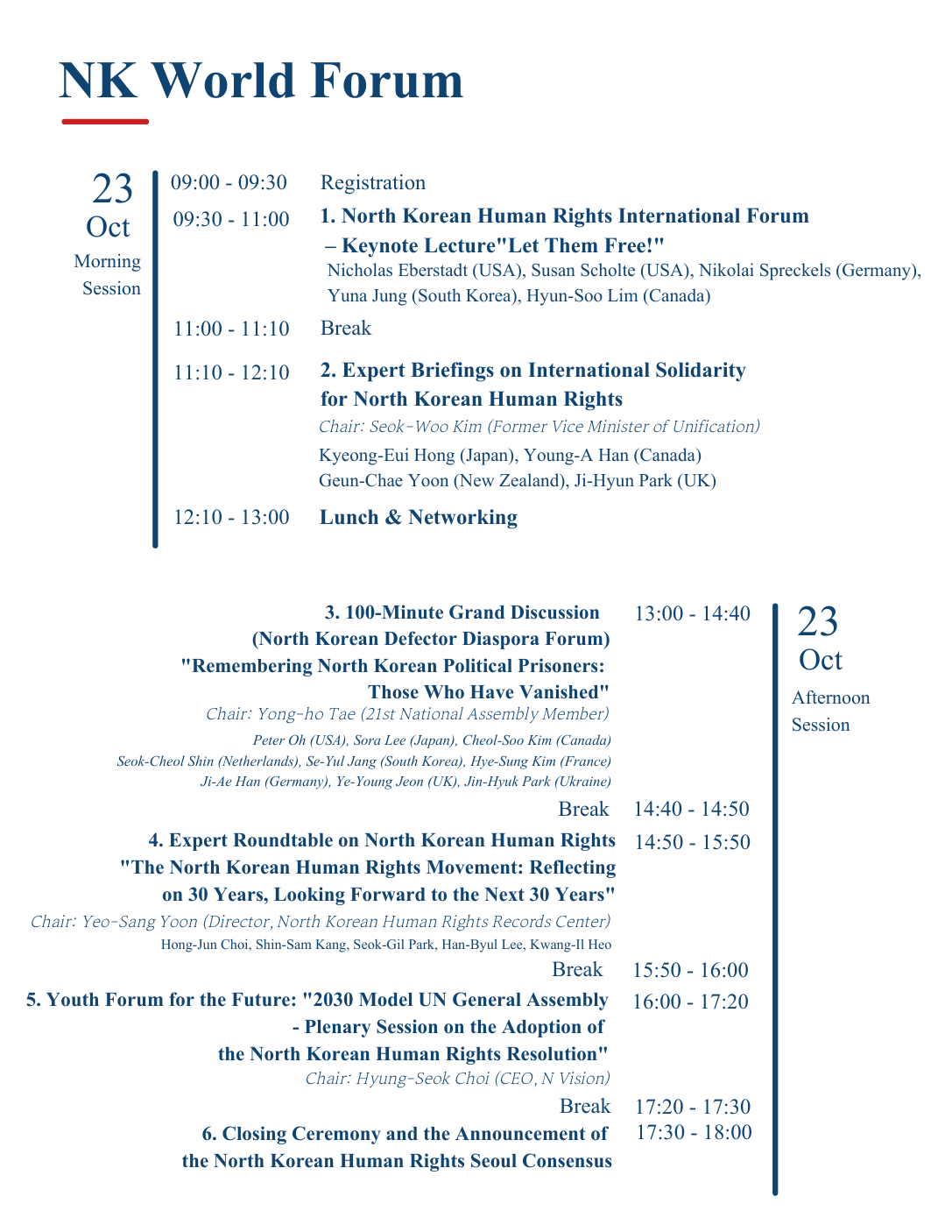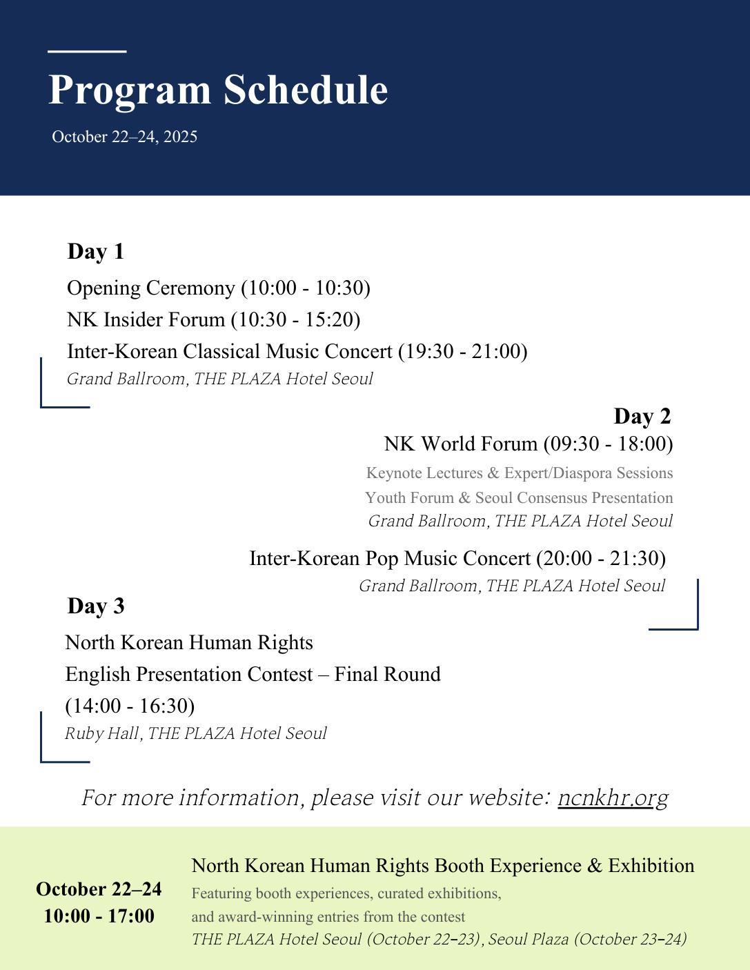 국내외 76개 북한인권단체 협의체인 북한인권민간단체협의회와 미국 인권재단(Human Rights Foundation, USA)이 공동주최하며, 2025년 10월 22~24일 더플라자호텔서울, 서울광장에서 열립니다.
