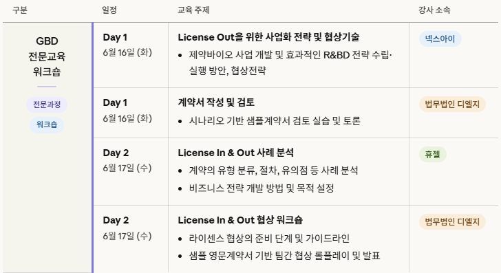 [교육 개요] 🔹과정명 :Global Business Development(GBD) 전문교육 워크숍 🔹일시·장소 : 2026년 6월 16일(화) ~ 17일(수) 09:30-17:30 🔹신청기간 :~ 2026년 6월 2일(화) 17:00 🔹수강대상 : 글로벌 BD 업무 5년차 이하의 제약바이오종사자 🔹수강정원 : 30명 이내 🔹과정소개 :글로벌 진출역량 강화를 위해 국내 글로벌 BD 실사례 기반 문제해결형 학습과 훈련 워크숍(2일과정) 🔹교육비 : 회원사 88만원, 비회원사 132만원 (VAT 포함) 🔹프로그램 안내 |