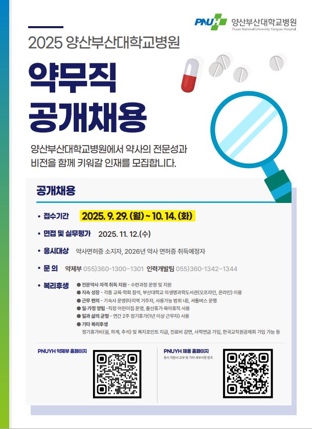 양산부산대병원 약무직 신규직원 채용 안내드립니다.