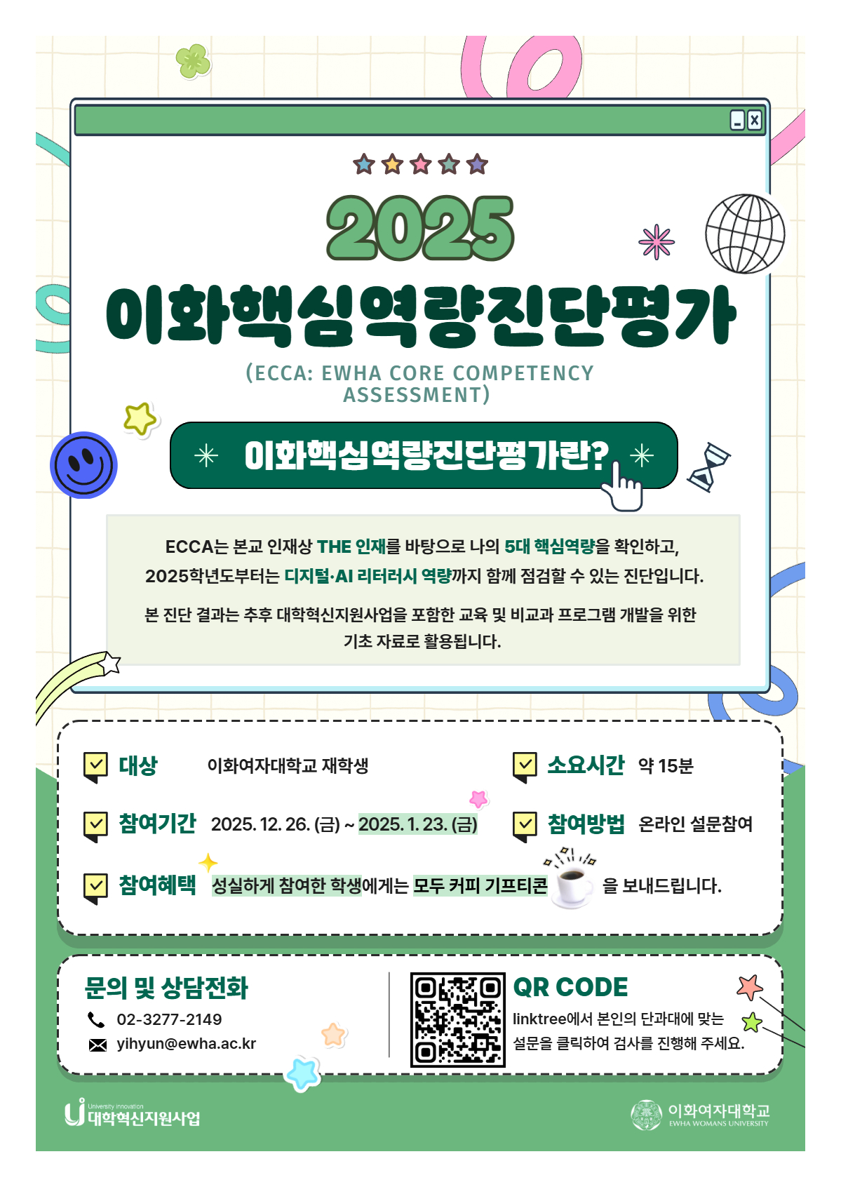 [사회대/미래혁신센터] 2025년 대학혁신지원사업 성과 측정을 위한 이화핵심역량진단평가(ECCA) 재학생 참여 홍보 요청