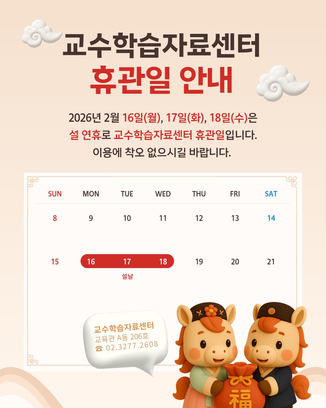 [교수학습자료센터] 설 연휴(2/16(월)~18(수)) 휴관 안내